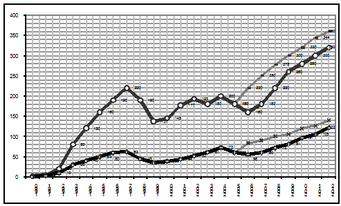 Анализ потребления основных продуктов питания как по совокупности в целом, так и внутри выделенных по уровню среднедушевого денежного дохода групп показал, что отклонения в потреблении овощей и бахчевых, хлеба и хлебопродуктов, картофеля и яиц от среднего уровня потребления в группах и от среднего уровня по совокупности незначительны. Исчисленные показатели позволяют заключить, что средний уровень потребления относительно дешевых продуктов питания (хлеба и хлебопродуктов, овощей и бахчевых, картофеля, сахара и яиц) в низкодоходных группах не имеет тесной связи с уровнем дохода. Эти продукты потребляются всем низкодоходным населением примерно одинаково, хотя очень незначительная дифференциация потребления все же существует. Наиболее существенная дифференциация потребления в разрезе низкодоходных групп с различным уровнем среднедушевого денежного дохода была отмечена по молоку и молокопродуктам, жирам, рыбе и рыбопродуктам, мясу и мясопродуктам, фруктам и ягодам. Значительно меняется уровень потребления жиров с ростом среднедушевого денежного дохода. Средний уровень потребления жиров в I группе в 2,3 раза ниже, чем в IV и в 1,7 раза ниже, чем во II группе. Достаточно сильно дифференцировано в низкодоходных семьях потребление рыбы и рыбопродуктов: с ростом доходов существенно снижается потребление рыбы. Средний уровень потребления рыбы и рыбопродуктов в IV группе в 2,6 ниже, чем в I группе. Уровень потребления мяса и мясопродуктов резко увеличивается лишь в низкодоходных семьях IV группы домашних хозяйств: он в 2,5 раза больше, чем средний уровень потребления во II группе. Потребление фруктов и ягод в I-III группах возрастает постепенно, скачок среднего уровня происходит лишь в IV – самой высокодоходной группе совокупности низкодоходных семей, в ней потребление фруктов и ягод выше на 1,6 кг по сравнению с I группой. По экспертным оценкам специализированных агентств при развитии рынка продуктов питания проявляются примерно одинаковые тенденции. Эти тенденции работают независимо от расположения: в городе, в области в целом. Также на объем потребления мало влияют и культурные особенности, и другие факторы. Рассмотрим рисунок 5