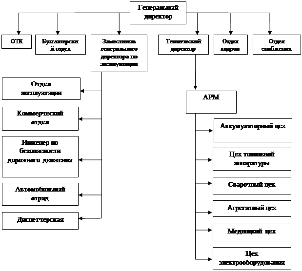 Рис. 1. Структура предприятия Руководитель предприятия генеральный директор: в прямом подчинении у него находятся: 1. Отдел технического контроля: контроль за исправностью подвижного состава. 2. Бухгалтерский отдел. 3. Отдел кадров. 4. Отдел снабжения: учет, закупка запасных частей, ГСМ. 5. Заместитель генерального директора по эксплуатации отвечает за эксплуатацию подвижного состава, ему подчиняются: - отдел эксплуатации: учет наработки подвижного состава; - коммерческий отдел: заключение договоров на перевозку грузов; - инженер по безопасности дорожного движения: профилактика дорожных происшествий, организация и проведение занятий с водителями по безопасности дорожного движения; - автомобильный отряд: водители автомобилей; - диспетчерская: учет автомобилей, находящихся на маршрутах. 6. Технический директор отвечает за своевременный ремонт подвижного состава, в его подчинении находится автомобильная ремонтная мастерская, в которую входят следующие подразделения: Аккумуляторный цех: обслуживание, зарядка, диагностика аккуму ляторных батарей, подготовка электролита, восстановление клемм, замена корпусов; •Цех топливной аппаратуры: ремонт, диагностика топливной аппаратуры автомобилей (бензиновых и дизельных); •Сварочный цех: выполнение сварочных работ; •Агрегатный цех: ремонт и диагностика агрегатов трансмиссии, подвески и ходовой части, ремонт двигателей; •Медницкий цех: работы по ремонту радиаторов; •Цех электрооборудования: ремонт деталей пли агрегатов с диагностикой их на стендах; Основной деятельностью ОАО «Хабаровский грузовой комбинат» являются перевозки грузов в городском, междугородном и международном сообщениях. В целях осуществления основных своих функций, Автокомбинат имеет в своем составе бортовые автомобили марки ЗиЛ-130, КамАЗ-5320, седельные тягачи КамАЗ-5410, КамАЗ-54112, МАЗ-54329 и автомобили-самосвалы КамАЗ-55111 и ЗиЛ-ММЗ. Парк специализированных полуприцепов-контейнеровозов для перевозки грузов в 20, 30, 40-футовых контейнерах позволяет обеспечить перевозки для значительного числа клиентов. Автокомбинатом определена клиентура для заключения договоров на перевозку грузов. В договоры внесены данные с учетом всех видов оплаты, предусмотрены расценки за простой под погрузочно-разгрузочными операциями, превышение грузоподъемности, задержку подвижного состава по вине клиента. Разработаны договоры на все виды перевозок (городские, междугородные и международные). Для разовых клиентов разработана "счет-фактура — договор". На весь подвижной состав и на все виды транспортных услуг имеются лицензии "Ространсинспекции". Философия предприятия — это надежность и быстрота выполнения заказов клиентов. Успешная деятельность в данном бизнесе обусловливает необходимость поиска новых перспективных рынков и наращивание объемов перевозок, что потребует приобретения более конкурентоспособных транспортных средств. Для расширения бизнеса в Автокомбинате имеется выококвали-фицированный персонал управления, установивший тесные контакты с фирмами - грузоотправителями (грузополучателями), а также водительский состав, подготовленный для международных перевозок. Успешная работа предприятия на рынке международных транспортных услуг обусловливает необходимость увеличения объемов перевозок и приобретения для этих 