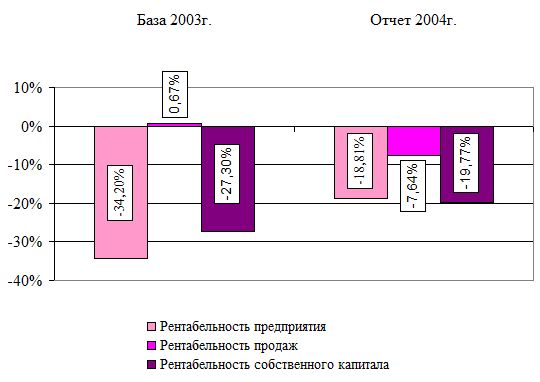 В 2004г. прибыль от реализации продукции уменьшилась на 33 115 тыс. руб. по сравнению с 2003 г. Методом цепных подстановок рассмотрим, какое влияние на это изменение оказали факторы: 1) изменение объема реализации: