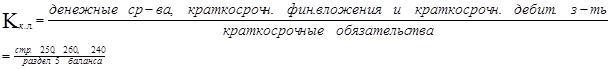 Из полученных данных можно сделать вывод, что ликвидность баланса за 2003 г. и 2004 г. не абсолютна. Предприятие испытывает недостаток в наиболее ликвидных активах (денежных средствах) для покрытия кредиторской задолженности, и в то же время обладает значительными резервами быстрореализуемых активов, большую часть которых составляет дебиторская задолженность. Мгновенную платежеспособность предприятия характеризует коэффициент абсолютной ликвидности , показывающий, какую часть краткосрочной задолженности может покрыть организация за счет имеющихся денежных средств и краткосрочных финансовых вложений, быстро реализуемых в случае надобности.