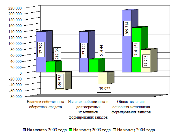 Таким образом, относительные показатели ликвидности на начало 2003 г. меньше нормы, к концу 2003 г. наблюдается уменьшение данных показателей в несколько раз. К концу 2004 г. показатели ликвидности в основном имеют тенденцию к дальнейшему снижению, таким образом к концу 2004 г. платежеспособность предприятия ухудшилась. 3. Абсолютные и относительные показатели финансовой устойчивости предприятия; дать оценку финансовой устойчивости предприятия; представить результаты расчета абсолютных показателей финансовой устойчивости графически Наиболее полно финансовая устойчивость предприятия может быть раскрыта на основе изучения соотношений между статьями актива и пассива баланса.Соотношение стоимости запасов и величин собственных и заемных источников их формирования – один из важнейших факторов устойчивости финансового состояния предприятия. Степень обеспеченности запасов источниками формирования выступает в качестве причины той или иной степени текущей платежеспособности (или неплатежеспособности) организации. Общая величина запасов предприятия равна сумме величин стр. 210 «Запасы» и стр. 220 «НДС по приобретенным ценностям». Для характеристики источников формирования запасов используется несколько абсолютных показателей, отражающих различную степень охвата разных видов источников: – наличие собственных оборотных средств СОС = СК – ВА, где СОС – собственные оборотные средства, СК – собственный капитал, ВА – внеоборотные активы; – наличие собственных и долгосрочных заемных источников формирования запасов СДП = СК + ДП – ВА,где СДП – собственные и долгосрочные пассивы,ДП – долгосрочные пассивы; – общая величина основных источников формирования запасов ВИ = СК + ДП + КП – ВА, где ВИ – все источники формирования запасов, КП – краткосрочные пассивы (краткосрочные заемные средства стр. 610 баланса). Трем показателям наличия источников формирования запасов соответствуют три показателя обеспеченности запасов источниками их формирования: – излишек или недостаток собственных оборотных средств Ф СОС = СОС – З,где З – запасы; – излишек или недостаток собственных и долгосрочных заемных источников формирования запасов Ф СДП = СДП – З; – излишек или недостаток общей величины основных источников формирования запасов Ф ВИ = ВИ – З. С помощью данных показателей можно классифицировать финансовые ситуации по степени их устойчивости. Возможны 4 финансовые ситуации: 1. абсолютная устойчивость финансового состояния Ф СОС > 0, Ф СДП > 0, Ф ВИ > 0; 2. нормальная устойчивость финансового состояния Ф СОС < 0, Ф СДП > 0, Ф ВИ > 0; 3. неустойчивое финансовое состояниеФ СОС<0, Ф СДП<0, Ф ВИ>0; 4. кризисное финансовое состояниеФ СОС < 0, Ф СДП < 0, Ф ВИ < 0; АНАЛИЗ ОБЕСПЕЧЕННОСТИ ЗАПАСОВ ИСТОЧНИКАМИ ИХ ФОРМИРОВАНИЯ