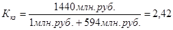 где Р - расчеты; ИБ – итог баланса. На начало 2008 года: На конец 2008 года: Таким образом, за отчётный период коэффициент уменьшился, однако организация всё ещё остаётся зависимой от условий, выдвигаемых кредиторами. Сумма коэффициентов (Ккск) и (Кшс) равна единице (или 100%). Коэффициент финансовой зависимости (Кфз) является обратным коэффициенту концентрации собственного капитала: