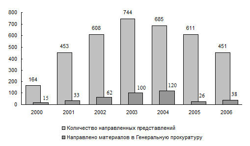 Рис. 3.1. Динамика представлений Счетной палаты в Генеральную прокуратуру Критерий действенности включает показатели: · количество исполненных представлений и предписаний; · объем средств, возвращенных в федеральный бюджет и на бюджетные счета организаций; · количество структурных преобразований в экономике, министерствах, ведомствах и на предприятиях, осуществленных по представлениям Счетной палаты; · увеличение доходной части бюджета или экономии его расходной части, полученные по представлениям Счетной палаты; · количество поправок в действующее законодательство; · количество постановлений Правительства Российской Федерации, принятых по представлениям Счетной палаты; · количество решений (приказы, распоряжения, нормативные акты), принятых по представлениям Счетной палаты; · количество уголовных дел, открытых по представлениям Счетной палаты. В 2001 году Генеральной прокуратурой было возбуждено 49 уголовных дел по материалам контрольных мероприятий, проведенных Счетной палатой (с учетом возобновленных уголовных дел). Количественные данные о рассмотрении и выполнении представлений Счетной палаты в 2006 году приведены в таблице. Табл.3.1. Количественные данные о рассмотрении и выполнении в 2006 году представлений, направленных Счетной палатой Российской Федерации по результатам контрольных мероприятий