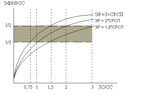 Рис.2.1. Графическое представление возможности привлечения заемных средств фирмой (закрашена область оптимального соотношения заемных и собственных средств) 1. На сегодняшний день (т. е. пока без нового кредита) экономическая рентабельность активов предприятия Б в 2,3 раза превышает среднюю расчетную ставку процента (40% : 17,5% = 2,3). Предприятие устанавливает приемлемую степень снижения дифференциала, например, не ниже уровня ЭР = 2 СРСП, и исходя из этого рассчитывает желательную ставку и сумму процентов по будущему кредитному договору, вводя в вычисления, если нужно, прогнозируемый уровень экономической рентабельности. 2. Предприятия не платят налогов, находясь в своеобразном “налоговом раю” 3. Следует заметить, что имеются оптимальные значения для ЭФР и плеча рычага. Такое значение ЭФР находится на рис. 5 между величинами 1/2 и 1/3 РСС (цифра получена на основании изучения эмпирического материала по хорошо работающим корпорациям Запада). 4. Остается определить, вписывается ли рассчитанная ранее “по потребностям” сумма кредита в безопасное значение плеча финансового рычага. Пересечение горизонтали “ЭФР/РСС = 1/3” с кривой “ЭР = 2 СРСП” дает единичное значение плеча финансового рычага, — при том, что пока ЗС : СС = 3,7 млрд. руб. : 6,8 млрд. руб. = 0,54. Новый кредит в размере 3,1 млрд. руб. как раз довел бы плечо финансового рычага до единицы. Рассчитанная же финансистами предприятия потребность в новом кредите составляет 2,8 млрд. руб. При такой сумме кредита плечо финансового рычага будет равно: (3,7 млрд. руб. + 2,8 млрд. руб.) : 6,8 млрд. руб. = 0,96, и предприятие сможет даже слегка поднять новую кривую своего дифференциала над кривой “ЭР = 2 СРСП”, а также сохранить некоторый резерв заемной способности на случай возможных затруднений. Предприятие А при плече финансового рычага равном 1 еще может набирать кредиты, но дифференциал уже близится к нулю. Малейшая заминка в производственном процессе или повышение процентных ставок могут “перевернуть” знак эффекта финансового рычага. Предприятие Б при плече финансового рычага равном 0,54 также может продолжать привлекать заемные средства, ее дифференциал превышает 20 процентов. Это значит, что непосредственным риском эффект финансового рычага в данный момент не угрожают. Таким образом, если новое заимствование приносит предприятию увеличение уровн я эффекта финансового рычага, то такое заимствование выгодно. Но при этом необходимо внимательнейшим образом следить за состоянием дифференциала: при наращивании плеча финансового рычага банкир склонен компенсировать возрастание своего риска повышением цены своего “товара” — кредита. Риск кредитора выражен величиной дифференциала: чем больше дифференциал, тем меньше риск; чем меньше дифференциал, тем больше риск. В этом случае для сохранения прежней степени эффекта финансового рычага придется доводить плечо финансового рычага до более высоко уровня, и далее может наступить момент, когда дифференциал станет меньше нуля. Эффект финансового рычага будет действовать тогда лишь во вред предприятию.[11] 4. Особенности расчета финансового рычага в российской практикеРассмотренный ранее способ расчета эффекта финансового рычага можно найти практически в любом российском учебнике или учебном пособии по финансовому менеджменту или финансам организаций (п