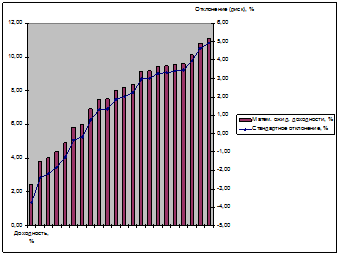 Согласно полученным расчетным данным, величина стандартного отклонения колеблется в пределах от -3,72 до 4,94% от среднего значения. Поэтому примем 5% размер отклонения как границу допустимого риска. Причем величина риска обратно пропорциональна доходности и прямо пропорционально отклонению. Если принять величину отклонения за меру риска, то отрицательное отклонение не только снижает риск, но и доходность, и наоборот (рис. 6).