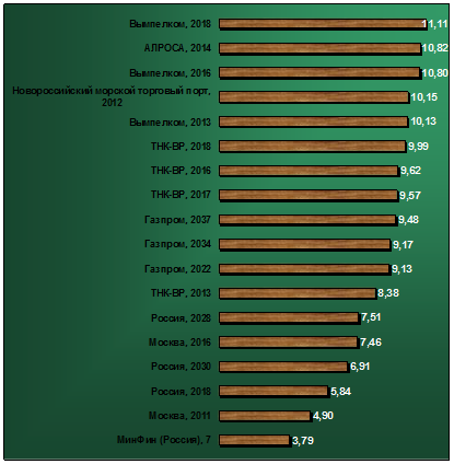 Рис. 11. Доходность еврооблигаций ОАО «МХК «ЕвроХим» на начало 2010 г. (проект) Найденная структура оптимального портфеля еврооблигаций в дальнейшем может использоваться при укрупнении или дальнейшей диверсификации портфеля ценных бумаг ОАО «МХК «ЕвроХим», при включении в него новых финансовых инструментов (акций). ЗаключениеОАО МХК «ЕвроХим» – крупнейший в России производитель минеральных удобрений, входит в тройку европейских и десятку мировых лидеров отрасли. ЕвроХим ставит перед собой цель наращивать капитализацию. Для компании это означает необходимость увеличения производственных мощностей, расширения продуктовой линейки и снижения себестоимости продукции. Все это требует дополнительных капитальных вложений, которые компания получает за счет эмиссии собственных облигаций, а с недавних пор – путем формирования портфеля ценных бумаг, приносящих дополнительный устойчивый доход. В течение многих лет облигации считались достаточно примитивным и негибким способом вложения капитала, способным лишь обеспечить текущий доход и практически ничего сверх того. Еврооблигации имеют значительно больший потенциал, чем традиционные банковские депозиты, валюта или недвижимость. В качестве эмитентов еврооблигаций выступают ТОР‑30 российских банков и крупные российские корпорации, которые имеют возможность выходить на западные рынки и привлекать заемные средства. Доходности по бумагам очень привлекательны и могут существенно превышать ставки по депозитам тех же банков при довольно высоком качестве заемщика. Руководствуясь именно этими соображениями, предприятием и был сформирован портфель инвестиций, состоящий целиком из еврооблигаций различных эмитентов. Учитывая, что основная доля облигаций приходится на смешанный тип по уровню доходности, а средняя доходность портфеля составляла в 2009 г. 9,43%, следует охарактеризировать данный тип портфеля ОАО «МХК «ЕвроХим» как умеренно-агрессивный. Однако, по сравнению с началом 2009 г. на начало 2010 г. в структуре инвестиционного портфеля ОАО «МХК «ЕвроХим» произошли следующие изменения: – облигации Aries, 2009; Вымпелком, 2009; Газпром, 2009 погашены в течение года и отсутствуют в портфеле; – число федеральных еврооблигаций в портфеле снизилось с 6 до 5 видов; – для замещения погашенных облигаций Вымпелком, 2009 и Газпром, 2009 приобретены МТС, 2012 и Газпром, 2012 в соответствующем объеме; – общее количество видов ценных бумаг снизилось с 23 до 22; – за счет снижения совокупного объема федеральных еврооблигаций в портфеле его стоимость снизилась на 400 млн. у. е. в долларовом эквиваленте и составила 13960 тыс. долл. Расчеты показали, что доходность инвестиционного портфеля еврооблигаций ОАО «МХК «ЕвроХим», составляет на начало 2010 года 6,17%. Таким образом, средняя доходность портфеля снизилась с начала года в результате снижения котировок отдельных облигаций на 3,26%. Это означает, что в результате снижения объема инвестиционного портфеля и снижения котировок сумма недополученной годовой прибыли может составить 492,72 тыс. долл. Поэтому необходимы меры по оптимизации портфеля инвестиций с целью восстановления объема дохода, им приносимым. Можно констатировать, что в настоящее время инвестиционный портфель еврооблигаций ОАО «МХК «ЕвроХим» практически безрисковый, т.е. консервативный, поэтому имеет см