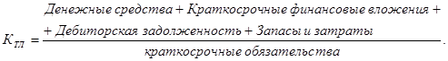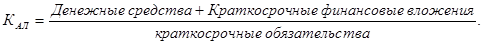 Он показывает, какую часть краткосрочных обязательств предприятие может погасить своими абсолютно ликвидными активами. Минимально допустимым признано значение равное 0,2. Коэффициент текущей ликвидности КТЛ: