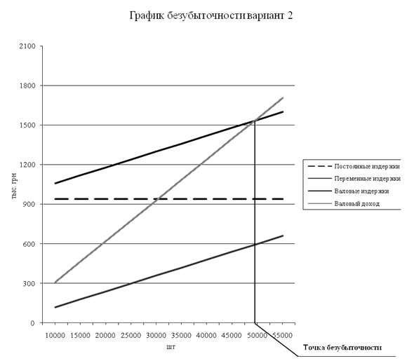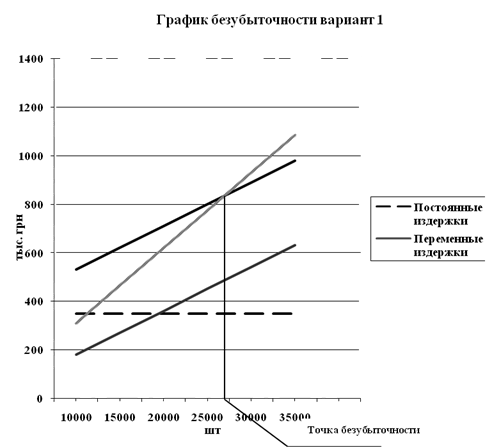 Решение: Расчетным путем определим точку безубыточности для каждого альтернативного варианта по формуле: ТБ = ТБ – объем безубыточности, шт; ПИ – постоянные издержки, грн; Ці – цена за единицу продукции, грн; ПерИі – переменные издержки за единицу продукции, грн. Для первого варианта ТБ1