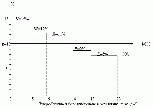 Поскольку измеряется ожидаемая стоимость нового (или привлекаемого) капитала, необходимо использовать рыночные оценки стоимости каждой из составляющих, а не данные из бухгалтерской отчетности (которые могут значительно отличаться). Дополнительно, другие, более редкие источники финансирования, такие как конвертируемые облигации, конвертируемые привилегированные акции и прочие, будут включаться в формулу только в случае, если они присутствуют в значительных объёмах, поскольку стоимость подобного финансирования обычно отличается от стандартных облигаций и акций. В обычных условиях формирование бюджета капиталовложений по сути является применением следующего классического экономического принципа: фирма должна расширяться до тех пор, пока ее предельный доход не станет равным ее предельным затратам. В случае формирования бюджета капиталовложений предельный доход понимается как доходность по проектам с учетом риска, а предельные затраты – как предельная цена капитала фирмы (см. рис. 3.). Предполагается, что предприятие имеет 5 одинаково рисковых независимых проекта с общим объемом требуемых капиталовложений 23 млн. руб. Цена капитала принимается постоянной и равной 10%.