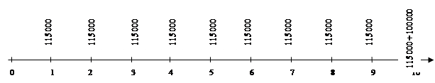 Таким образом, на депозитный счет в банке необходимо разместить 542 383,6 грн, чтобы при этих условиях через три года получить 900 000 грн. Наиболее эффективным для предприятия является вложение меньшей суммы средств, то есть 508 026,5 грн. под 21% сложных процентов в год. Ответ: 508 026,5 грн под 21% сложных процентов в год. Задача 3 Предприятие планирует приобретение промышленного оборудования, при этом первоначальные затраты оцениваются в размере 600 тыс. грн. В течение первого года планируется инвестировать дополнительно 230 тыс. грн. (в прирост оборотного капитала). Денежный поток планируется в размере 115 тыс. грн. в год. Ликвидационная стоимость оборудования через 10 лет составит 100 тыс. грн. Необходимо определить текущую стоимость денежных потоков ежегодно и экономический эффект в результате реализации данных инвестиций, если проектная дисконтная ставка составляет 10%. Результаты расчетов оформить в виде таблицы. Решение Составим схему инвестиционного процесса
