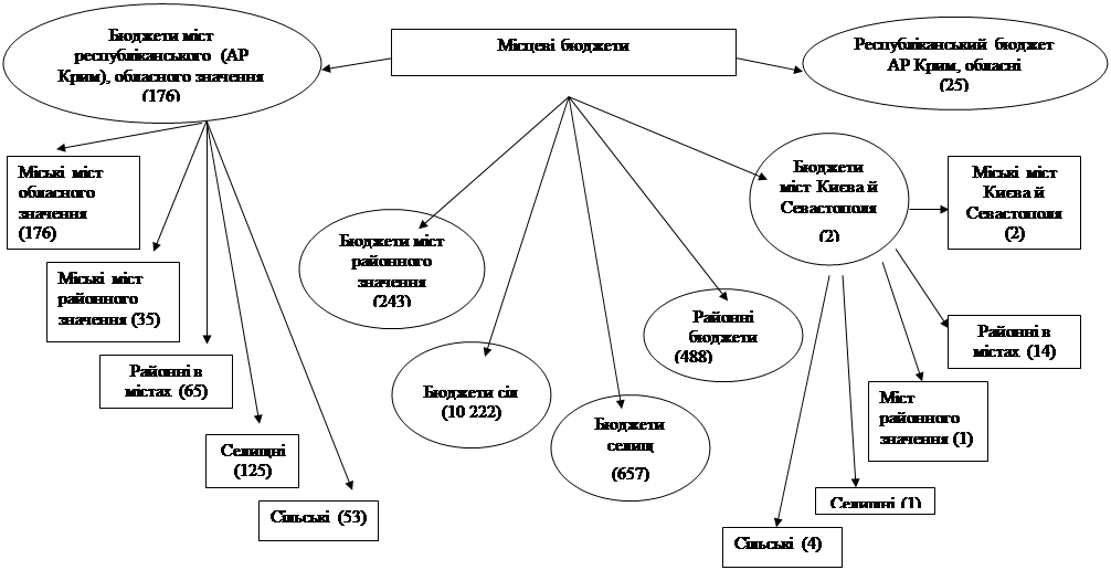 Всього 12 111 місцевих бюджетів Рисунок 1.1. Склад місцевих бюджетів України. Реалізація цього положення вимагає визначення розміру гарантованого рівня витрат на соціально-економічний розвиток адміністративно-територіальних одиниць. Забезпечення такого рівня має здійснюватись з урахуванням сукупності відносин щодо розподілу і використання фінансових ресурсів, створюваних на відповідній території і перерозподільчих регіональних процесів. Важливе значення для забезпечення фінансування процесу розширеного відтворення на відповідній території є розробка бюджету розвитку у складі місцевих бюджетів. Неможливо переоцінити важливість фінансування капіталовкладень на рівні місцевого самоврядування. Великі витрати на створення інфраструктури при обмежених податкових ресурсах змушують дуже ретельно відбирати й фінансувати капітальні засоби, і надзвичайно важливим є зв'язок із фінансуванням шляхом одержання позики. У звіті Світового банку за 2006 р. відзначено зв'язок між капітальними засобами та економічним розвитком: "Добра інфраструктура підвищує продуктивність і знижує витрати виробництва, але вона повинна достатньо швидко розростатися, щоб відповідати розвиткові. Тісний зв'язок між інфраструктурою і розвитком ще чекає свого обговорення. Але нарощування потужності інфраструктури іде пліч-о-пліч з обсягом виробництва: зростання фондів інфраструктури на 1% супроводжується зростанням на 1 % ВВП у всіх країнах". Бюджет розвитку місцевих бюджетів, який включає планування капіталовкладень на поточний період, є надзвичайно важливою частиною місцевого бюджету, оскільки програми капіталовкладень є фундаментом економічного розвитку території. Кошти цього бюджету спрямовуються на розбудову соціальної та виробничої інфраструктури адміністративно-територіальної одиниці. Таким чином реалізується положення ст. 143 Конституції України та Закону "Про місцеве самоврядування" про надання місцевій владі реальних можливостей здійснення довготривалої програми соціально-економічного розвитку території. Дослідження, проведене представництвом Світового банку в Україні, засвідчило, що інфраструктура перебуває в дуже поганому стані в більшості населених пунктів, заклади освіти та охорони здоров'я недостатньо фінансуються. Дослідження показало, що в 2006-2008 рр. середня кількість соціальних об'єктів у населених пунктах зменшувалась з часом, за виключенням виїзних клінік. Багато з розглянутих населених пунктів фінансово не спроможні утримувати наявну інфраструктуру. Муніципальна інфраструктура недорозвинена. Лише 3,8% населення використовують централізоване опалення, і 9,7% - мають доступ до централізованого збору сміття. 67% респондентів вважають якість шляхів задовільною. Усі ці суспільні блага і послуги погребують великих інвестицій, які місцеві органи влади не можуть собі дозволити, зважаючи на обмежені ресурси. Окрім того, 56% респондентів зауважили, що стикалися з правовими або фінансовими проблемами, пов'язаними з муніципальною / комунальною власністю. Поліпшення виробничої та соціальної інфраструктури сприяє поліпшенню якості життя в адміністративно-територіальній одиниці через поліпшення стану доріг, водо - та енергозабезпечення, стану будівель як житлових, гак і закладів освіти, охорони здоров'я тощо. Все це забезп