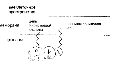 СодержаниеВведение. 2 Из истории открытия С-белков. 8 Структура и свойства. 8 Связь с мембраной. 9 Стуктурно-функциональная организация G-белков. 9 Классификация по чувствительности к токеинам.. 10 Сопряжение с эффекторными системами. 10 Регуляция активности G-белков. 11 Аденилатциклаза. 12 Фосфолипазы.. 13 Протеинкиназы.. 14 Фосфодиэстеразы.. 16 Аденилатциклазная система. 17 Влияние бактериальных токсинов на активность аденилатциклазы (АДФ-рибозилирование G-белков) 20 Инозитолфосфатная система. 21 Участие белка кальмодулина в инозитолфосфатной передаче сигнала. 22 Саморегуляция системы.. 23 α-субъединица: общие свойства. 23 β и γ субъединицы: общая характеристика. 24 G-белки: βγ-субъединицы.. 25 ГТФ-связывающие белки образуют два основных семейства G-белков и низкомолекулярных ГТФ-связывающих белков. 28 Литература. 30 ВведениеСигнальные G-белки являются универсальными посредниками при передаче гормональных сигналов от рецепторов клеточной мембраны к эффекторным белкам, вызывающим конечный клеточный ответ. Когда семидоменная рецепторная молекула, локализованная в мембране сенсорной клетки, активируется какими-то изменениями во внешней среде, она претерпевает конформационные изменения. Последние детектируются G-белками связанными с мембраной, которые, в свою очередь, активируют эффекторные молекулы в мембране. Часто это приводит к выделению вторичных мессенджеров в цитозоль. Они являются объектом интенсивного изучения в связи с их участием во многих важных физиологических процессах. G-белки, участвующие в передаче сигнала, являются членами большого надсемейства гуанин-связывающих белков. G–белки - это прецизионные регуляторы, включающие или выключающие активность других молекул. Примерно 80% первичных мессенджеров (гормоны, нейротрансмиттеры, нейромодуляторы) взаимодействуют со специфическими рецепторами, которые связаны с эффекторами через G-белки. G-белки - белки, связывающие гуанозиновые нуклеотиды. G-белки, ассоциированные с рецепторами, связаны с мембраной. В неактивном состоянии они связаны с GDР. При связывании рецептора с лигандом ГДФ замещается на ГТФ, в результате чего происходит активация. Процесс этот сравнительно медленный, протекающий в течение секунд - десятков секунд. G-белки биологических мембран имеют гетеротримерную структуру. Они состоят из большой α-субъединиц (около 45 килодальтон - кДа), а также меньших β и γ-субъединиц, α-субъединица обладает ГТФ-азной активностью, в неактивной (выключенной) форме она связывает молекулу ГДФ на активном сайте. Субъединицы β и γ связаны между собой, и в физиологических условиях не могут быть диссоциированы. В неактивном состоянии βγ-комплекс непрочно связан с α-субъединицей. γ-субъединица связана с цитоплазматическим листком биологической мембраны геранил-гераниловой цепью (20 атомов углерода в цепи), близкой по структуре к холестерину. α-субъединица также связана с мембраной жирной кислотой с длиной цепи в 14 атомов углерода (миристоевая кислота). Такие связи обеспечивают то, что комплекс G-белка удерживается в плоскости мембраны, но в то же время способен легко двигаться в этой плоскости. Легко себе представить, как весь комплекс G-белка с присоединенным ГДФ перемещается в плоскости мембраны под действием тепловых сил, два семейства белков - гетеротримерные гуанозиннуклеотид свя