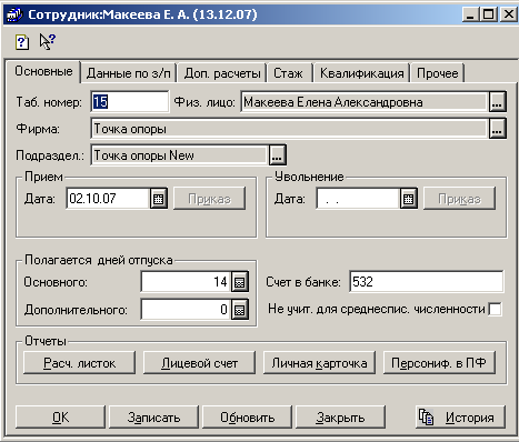 Рис.2.7.Вкладка «Прочие» В реквизиты закладки "Налоговые данные" вводятся индивидуальный налоговый номер сотрудника, название и адрес налоговой инспекции по его месту жительства. Такие реквизиты справочника, как "Тип сотрудника" (принимает значение "1" - если сотрудник основной, "0" - если совместитель), "Количество детей", "Количество льгот", "Должность", "Оклад" являются периодическими. Просмотреть историю изменений значений этих реквизитов у сотрудника можно с помощью кнопки "История". Эта кнопка доступна, как в форме представления списка сотрудников, так и на каждой закладке формы его элемента.