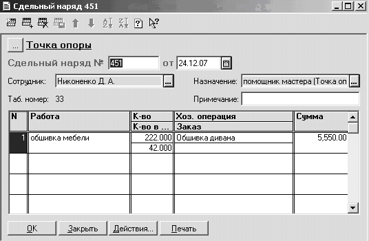 Рис.3.3.Документ « Сдельный наряд » Если заполнение было произведено правильно, документы «Наряд бригады» и «Сдельный наряд» попадают в журнал «Сдельная оплата»(Рис 3.3), в котором отражена вся информация о выполненной работе, как показано в таблице 2.1.