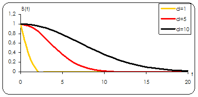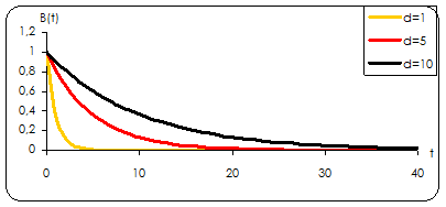 Bн (t)=exp[-t / d1 ], Рассматриваем для значений в = 1, 5, 10. График изменения автокорреляционной функции при различных d