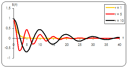 2. Радиус корреляции погрешностей r > Δx. Bн (t) = exp(-αt)cosβt; где α = 0,80 / r, β = π / 2r; Рассматриваем для значений r = 1, 5, 10. График изменения автокорреляционной функции при различных r