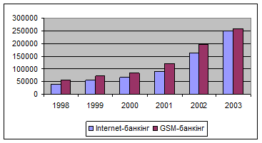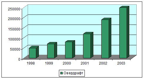 Малюнок 1.1. Розвиток Internet – та GSM-банкингу. Овердрафт – це короткострокове кредитування клієнтів Приватбанка – юридичних осіб з метою покриття короткострокових (до 30 днів) касових «розривів», у межах затвердженого ліміту. Динаміка розвитку овердрафтового кредитування наведена нижче (мал. 1.2). Метою овердрафтового кредитування є забезпечення безперервності проходження платежів в умовах недоліку коштів на рахунку клієнта при обов'язковому дотриманні відповідності цілей фінансування вимогам українського законодавства. Ліміт овердрафтного кредитування розраховується на підставі даних про фінансовий стані клієнта. Розрахунок ліміту для проведення овердрафтового кредитування виробляється за обліком надходжень тільки на той рахунок клієнта, на який надається овердрафт.