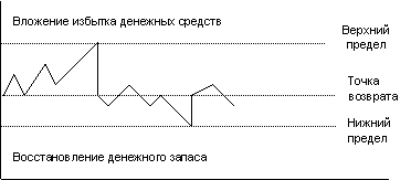 Первое слагаемое в этой формуле представляет собой прямые расходы, второе - упущенная выгода от хранения средств на расчетном счете вместо того, чтобы инвестировать их в ценные бумаги. Модель Миллера – Орра Модель Баумола проста и в достаточной степени приемлема для предприятия, в связи с тем, что денежные расходы принципе стабильны и. прогнозируемы. В иных случаях такое случается редко; остаток средств на расчетном счете изменяется случайным образом, причем возможны значительные колебания. Модель, разработанная Миллером и Орром, представляет собой компромисс между простотой и реальностью. Она помогает ответить на вопрос: как предприятию следует управлять своим денежным запасом, если невозможно предсказать каждодневный отток или приток денежных средств. Миллер и Орр использую при построении модели процесс Бернулли - стохастический процесс, в котором поступление и расходование денег от периода к периоду являются независимыми случайными событиями. Логика действий главного бухгалтера по управлению остатком средств на расчетном счете представлена па рисунке и заключается в следующем. Остаток средств на счете хаотически меняется до тех пор, пока не достигает верхнего предела. Как только это происходит, предприятие начинает покупать достаточное количество ценных бумаг с целью вернуть запас денежных средств к некоторому нормальному уровню (точке возврата). Если запас денежных средств достигает нижнего предела, то в этом случае предприятие продает свои ценные бумаги и таким образом пополняет запас денежных средств до нормального предела.