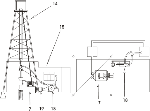 Рис.3.1 Схема бурового агрегата После монтажа буровой установки и проверки ее работы производится забуривание скважины в заданном направлении, после чего устье скважины закрепляется направляющей трубой. Все части бурового снаряда соединяются друг с другом при помощи резьбовых (герметичных) соединений. Верхняя ведущая бурильная труба пропускается сквозь шпиндель вращателя бурового станка, закрепляется в зажимном патроне, затем.. на нее навинчивается буровой сальник. Одновременно оборудуется система для очистки бурового раствора от частиц разбуренной породы. Для охлаждения коронки, очистки забоя от разрушенной породы и выноса на поверхность шлама скважину промывают. Бурение скважины производится в следующей последовательности. При помощи лебедки в скважину спускается буровой снаряд, собираемый из следующих частей: коронки 7, колонковой трубы 6, переходника 5, колонны бурильных труб 4, длина которой увеличивается по мере углубления скважины, вертлюг-сальника 3, нагнетательного шланга 2, соединяющего буровой снаряд с буровым насосом 1. Вращение бурового снаряда сопровождается нагнетанием под давлением промывочной жидкости буровым насосом. Раствор, насыщенный шламом разбуренной породы, поднимается вверх по стволу скважины, где поступает по системе желобов 8 в отстойник 9, где шлам опускается на дно, а осветленная вода в приемный бак 10.