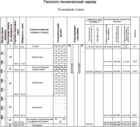 Для удержания снаряда в подвешенном состоянии применяются трубные хомуты и трубодержатели. Для свинчивания и развинчивания обсадных труб применяются двух- или трехшарнирные ключи. Каждый ключ может быть использован для свинчивания и развинчивания двух размеров обсадных труб. Для предохранения нижнего конца обсадной колонны от повреждений при спуске и во время бурения к нижнему ее концу присоединяется башмак обсадных труб 2.КОНСТРУКЦИЯ КОЛОНКОВЫХ СКВАЖИН Прежде чем приступить к бурению скважины, надо составить ее проектную конструкцию Исходными данными для выбора конструкции скважины служат: а) физико-механические свойства пород, пересекаемых скважиной, их крепость, устойчивость, водонасыщенность и т. д.; б) глубина скважины, наклон скважины; в) конечный диаметр скважины, который зависит от вида полезного ископаемого; г) способ бурения. Проектирование скважины начинается с выбора и обоснования глубины скважины, конечного диаметра бурения, начальных углов забуривания, технической конструкции скважины. Глубина картировочной скважины определяется установленной геологическим заданием глубиной геологического картирования. Глубина разведочной и поисковой скважин в общем случае устанавливается из необходимости пересечения скважиной тела полезного ископаемого и углубления в подстилающие породы на 2-20 м. Начальные углы забуривания зависят от угла падения и азимута падения тела полезного ископаемого или пластов горных пород, глубины скважины. Желательно, чтобы скважина пересекала пласты горных пород под углами, близкими к 700 -900 . Если углы падения пластов не превышают 300 , то скважины проектируются вертикальными. При больших углах падения необходимо бурение наклонных или искривленных скважин. Конечный диаметр бурения определяется, прежде всего, видом полезного ископаемого, которое требуется вскрыть, а точнее – требованиями к объему их проб. Большинство твердых полезных ископаемых не требует специфических видов анализа. При бурении их алмазными коронками рекомендуется принимать конечный диаметр скважины 46 или 59 мм. Для твердосплавного бурения конечный диаметр скважины следует брать 59, 76 мм. Бурение некоторых полезных ископаемых, требует более объемных проб для изучения. Например, бурение при разведке угольных месторождений, минеральных солей и других твердых полезных ископаемых, залегающих в толщах осадочных пород, производится твердосплавными коронками, причем при проходке по угольному пласту конечный диаметр скважины должен быть не меньше 76 мм, а при пересечении минеральных солей — не менее 92 мм. При разведке химического сырья и стройматериалов бурят скважины диаметром 93-200 мм. Разведка россыпных месторождений золота и платины производится скважинами диаметром 150-200 мм При инженерно-геологических исследованиях в основном бурят скважины диаметром 112-219 мм. При гидрогеологических изысканиях диаметры скважин определяются размерами существующих конструкций приборов и водоподъемного оборудования и колеблются в пределах 100-219 мм и более. Диаметры эксплуатационных скважин на воду определяются требуемой продуктивностью скважины и обычно не менее 168 - 300 мм. Основная масса этих скважин бурится в перемежающихся породах рыхлых, мягких и средней крепости. Часто бурение производится в песчано-глинистых грунтах, 