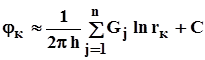 где G - массовый дебит любой скважины батареи, rj - расстояния от некоторой точки пласта до всех n скважин; h - толщина пласта.