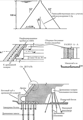 Рис.1.3 Плотина симметричного профиля высотой 100 м из особо тощего УБ с железобетонным экраном (предложение П. Лонде) 3.3 Определение отметки гребня плотины из укатанного бетонаОтметку гребня плотины следует назначать на основе расчета возвышения гребня (hs