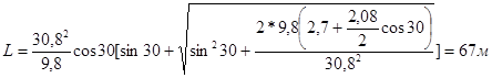 Принимаем Определение дальность отлета струи Дальность отлета струи L, отброшенной с трамплина, до встречи со свободной поверхностью нижнего бьефа определяется по формуле: