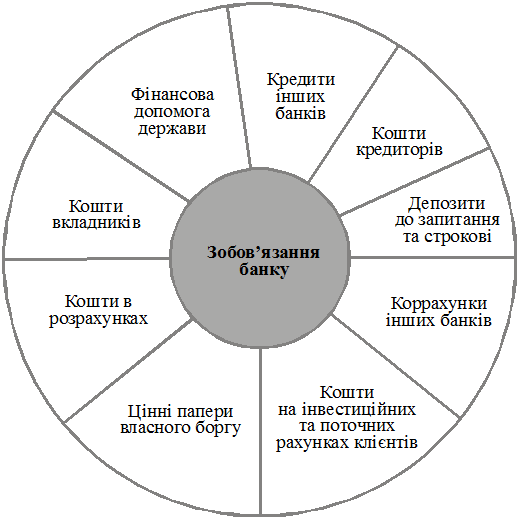 Під зобов’язаннями банку слід розуміти вимоги до активів банківської установи, що зобов’язують її сплатити фіксовану суму коштів у визначений час у майбутньому. У бухгалтерському обліку до зобов’язань включають кошти на поточних рахунках клієнтів; кредиторську заборгованість, заборгованість за нарахованими процентами та відстрочену дебіторську заборгованість за доходами, але не включають доходи, прибуток та внутрішньобанківські розрахунки.