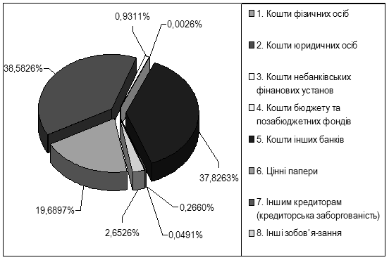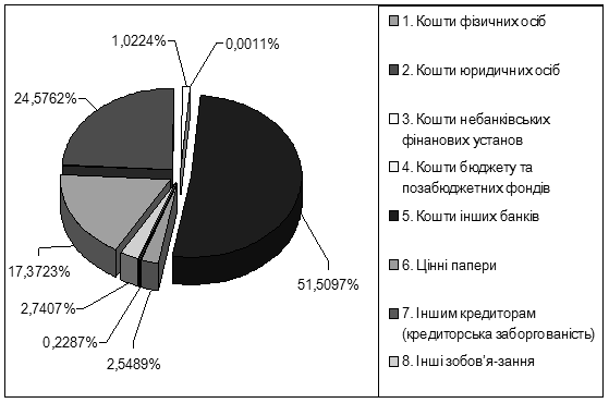 З даних таблиці 7 видно, що зобов’язання банку на 31 грудня 2007 р. становлять 11 784 723 тис. грн. Порівняно з зобов’язаннями на 31 грудня 2006 р. вони зросли на 6 653 336 тис. грн або на 129,66%. Безумовно, такий значний приріст ресурсної бази банку можна розцінювати як високоефективну роботу депозитного відділу щодо залучення ресурсів. Але ж зростання депозитної бази відбувалося в основному за рахунок приросту міжбанківських кредитів, а не за рахунок коштів фізичних та юридичних осіб, що є не дуже позитивною тенденцією. Кошти фізичних осіб зросли на 1 036 919 тис. грн і становили 2 047 274 тис. грн на 31 грудня 2007 р. проти 1 010 355 тис. грн на 31 грудня 2006 р., тобто зросли на 102,63%. У структурі залучених ресурсів їх частка зменшилась з 19,69% у 2006 р. до 17,37% у 2007 р., тобто на 2,32 процентного пункту. Характерно, що основним джерелом зростання коштів фізичних осіб є збільшення залучення строкових депозитів. За аналізований період їх маса зросла на 886 533 тис. грн, або на 136,47% і на 31 грудня 2007 р. їх частка в структурі зобов’язань становила 13,04%. Також зросли і кошти юридичних осіб: їх приріст становив за період, що аналізується, 916 413 тис. грн, або 46,29%. Так, на 31 грудня 2007 р. кошти юридичних осіб становили 2 896 237 тис. грн проти 1 979 824 тис. на 31 грудня 2006 р. Їх частка в структурі зобов’язань зменшилась з 38,58 до 24,58%, тобто зменшилась на 14,01 процентних пунктів. Основним джерелом збільшення коштів юридичних осіб є зростання строкових депозитів. Так, на 31 грудня 2007 р. вони становили 1 995 414 тис. грн проти 1 165 862 тис. грн на 31 грудня 2006 р., тобто зросли на 829 552 тис. грн, або на 71,15%. У загальній структурі зобов’язань їх частка зменшилась з 22,72 до 16,93%, тобто зменшилась на 5,79 процентних пунктів. Значно зросли кошти небанківських фінанових установ. Їх приріст становив за аналізуємий період 72 705 тис. грн, або 152,17%. Так, на 31 грудня 2007 р. кошти небанківських фінанових установ становили 120 483 тис. грн проти 47 778 тис. на 31 грудня 2006 р. Їх частка в структурі зобов’язань збільшилася з 0,93 до 1,02%, тобто збільшилася на 0,09 процентних пунктів. Основним джерелом збільшення коштів юридичних осіб є зростання зростання залишків на поточних рахунках. Так, на 31 грудня 2007 р. вони становили 36 892 тис. грн проти 5 322 тис. грн на 31 грудня 2006 р., тобто зросли на 31 570 тис. грн, або на 593,20%. У загальній структурі зобов’язань їх частка збільшилася з 0,10 до 0,31%, тобто збільшилася на 0,21 процентних пунктів. Основною причиною такого значного зростання залишків на клієнтських рахунках є ефективна маркетингова політика банку щодо залучення нових клієнтів через зниження тарифів на банківське обслуговування. Негативним явищем можна вважати і зростання частки коштів банків у структурі зобов’язань банку за одночасного зростання їх абсолютного розміру. Так, кошти інших банків на 31 грудня 2007 р. становили 6 070 274 тис. грн проти 1 941 015 тис. грн на 31 грудня 2006 р., тобто зросли на 4 129 259 тис. грн або на 212,74%. Проте їх частка у структурі зобов’язань зросла з 37,82% 2006 р. до 51,51% у 2007 р., тобто на 13,68 процентних пункти. Поєднання тенденції збільшення залежності від міжбанківського кредитування з одночасним розширенням ресурсної бази за рахунок цього джерела фінансування банківської діяльності свідчить про недостатність залучення ресурсів від населення та суб‘єктів господірювання для забезпечення запланованих темпів зростання активів банку (зокрема кредитного портфелю).