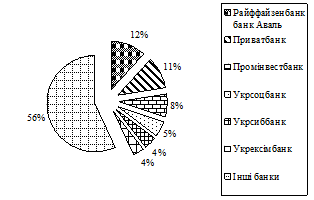 Рис. 4. 3. Поділ банківського ринку за активами Найістотніший вплив на ситуацію на банківському ринку мають найбільші 7 банків, яким належать понад 50 % сукупного ринку за активами. Аналізуючи ринок депозитів для фізичних осіб, зазначимо, що більшість вкладів зроблено у національній валюті (табл.1. 1., табл. 1. 2). Загальний обсяг вкладень коштів фізичними особами в банки України у національній валюті на 01.01.2007 року становлять 62 % (рис.1. 7). Частка мешканців Києва у депозитних вкладах України становить 31 %. Таблиця 4. 1 Структура зобов’язань банків за видами валют