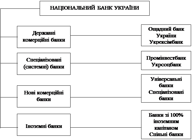 Рис. 1.1. Банківська система України Національний банк України (перший рівень) є центральним банком, особливим органом державного управління, який має статутний капітал у розмірі 10 мільйонів гривень, що є державною власністю. НБУ є економічно самостійним органом, який здійснює видатки за рахунок власних доходів у межах затвердженого кошторису, а в окремих випадках – також за рахунок Держбюджету України. Одержання прибутку не є метою його діяльності. Національний банк не відповідає за зобов'язаннями органів державної влади, а органи державної влади не відповідають за зобов'язаннямиНаціонального банку, крім випадків, коли вони добровільно беруть на себе такізобов'язання. НБУ не відповідає за зобов'язаннями інших банків, а інші банки не відповідають за зобов'язаннями Національного банку, крім випадків, коли вони добровільно беруть на себе такі зобов'язання. Основною функцією НБУ є забезпечення стабільності грошової одиниці. На виконання своєї основної функції Національний банк сприяє дотриманню стабільності банківської системи, а також, у межах своїх повноважень, — цінової стабільності. Традиційно виділяють чотири базові функції центрального банку: 1. емісія готівки та організація грошового обігу; 2. банк банків; 3. банк уряду; 4. реалізація грошово-кредитної політики. Крім зазначеного вище, до переліку функцій НБУ належить також наглядові, регулятивні й контрольні. Їх виконання забезпечується через: 1) здійснення всіх видів перевірок банків на місцях, інших кредитних установ та суб`єктів підприємницької діяльності, а також перевірку достовірності інформації, що надається юридичним та фізичним особам під час реєстрації банків, кредитних установ і ліцензування банківських операцій; 2) висунення вимог щодо проведення загальних зборів акціонерів банків та інших кредитних установ і визначення питань, за якими мають бути прийняті рішення. Згідно статті 7 Закону України «Про Національний банк України» функціями Національного банку є: 1) проведення грошово-кредитної політики; 2) монопольно здійснення емісії національної валюти України та організація її обігу; 3) організація системи рефінансування комерційних банків; 4) встановлення для банків правила проведення банківських операцій, бухгалтерського обліку і звітності; 5) організація створення та методологічного забезпечення системи грошово-кредитної і банківської статистичної інформації та статистики платіжного балансу; 6) визначення системи, порядку і форми платежів, у тому числі між банками; 7) визначення напрямів розвитку сучасних електронних банківських технологій; 8) здійснення банківського регулювання та нагляду; 9) ведення Державного реєстру банків та здійснення ліцензування банківської діяльності; 10) ведення офіційного реєстру ідентифікаційних номерів емітентів платіжних карток внутрішньодержавних платіжних систем;11) здійснення сертифікації аудиторів, які проводитимуть аудиторську перевірку банків, тимчасових адміністраторів та ліквідаторів банку; 12) складання платіжного балансу, здійснення його аналізу та прогнозування; 13) представлення інтересів України в центральних банках інших держав, міжнародних банках та інших кредитних установах; 14) здійснення валютного регулювання, організація і здійснення валютного контролю; 15) накопичення та зберігання золо