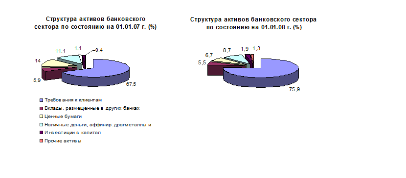 Как видно из таблицы 3, показатели адекватности собственного капитала банковского сектора по состоянию на 01 января 2008 года не изменились и составили k1 – 0,11 (при нормативе – 0,06) (для банка, участником которого является банковский холдинг норматив – 0,05), k2 – 0,14 (при нормативе -0,12) (для банка, участником которого является банковский холдинг норматив – 0,10). Вместе с тем, с начала года собственный капитал по балансу банков второго уровня увеличился с 1 января 2007 года на 556,3 млрд. тенге (63,9%) и составил на отчетную дату 426,7 млрд. тенге. Согласно таблицы 4 за прошедший 2007 год размер совокупных активов банков увеличился на 2 811,4 млрд. тенге (31,7%) и составил на отчетную дату 11 683,4 млрд. тенге. Прирост совокупных активов банковского сектора сектора по ценным бумагам уменьшился на 36,5%. Таблица 4 – Динамика совокупных активов банковского сектора