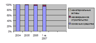 В структуре совокупных активов в 2006 - 1 кв. 2007 г. значительно увеличились основные средства, сократился НДС и запасы. 3.1 Внеоборотные активыНа конец анализируемого периода доля внеоборотных активов в структуре совокупных активов составляет 88%. На протяжении всего анализируемого периода большую часть внеоборотных активов составляют основные средства. Говоря о тенденции изменения основных средств, необходимо отметить, что, 2006 г. их величина в абсолютном выражении увеличилась более, чем в 5,5 раз (по сравнению с 2005 г). Увеличение стоимости основных средств произошло вследствие проведения их переоценки на 01.01.2006 г. Доля актива "Незавершенное строительство" на конец 2006 г. и на конец 1 кв. 2007 г. составляет менее 2%. Доля (и величина в абсолютном выражении) нематериальных активов сокращается с 2004 г.; на 01.04.2007 г. их стоимость равна нулю. Диаграмма 3. Динамика структуры внеоборотных активов, в % к внеоборотным активам.