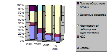 3.2 Оборотные активыЗа период с 2004 по 1 кв. 2007 гг. величина оборотных активов предприятия постоянно уменьшалась, достигнув минимального значения по итогам 1 кв. 2007 г. (почти в 2 раза меньше показателя 2004 г). Структуру оборотных активов и изменение ее основных составляющих можно охарактеризовать следующим образом: доля денежных средств на протяжении всего рассматриваемого периода составляла не более 1% оборотных активов предприятия. По состоянию на конец 1 кв. 2007 г. доля данного актива снизилась до 0,5% оборотных активов; в абсолютном выражении рост денежных средств составил более, чем 2,5 раза; доля краткосрочной дебиторской задолженности постоянно росла с 38% в 2004 г. до 81%; в абсолютном выражении рост задолженности составил 36% (по сравнению с 2004 г). Рост дебиторской задолженности негативно характеризует деятельность предприятия, снижая его ликвидность, а также уменьшая количество свободных средств в обороте предприятия; доля запасов в структуре оборотных активов невелика (14% оборотных активов на 01.04.2007 г) и постоянно снижается (на конец 2004 г. она составляла 53% оборотных активов); доля НДС испытывает постоянные колебания от 12% в структуре оборотных активов в 2005 г. до 3% в 2006 г. За 1 кв. 2007 г. величина НДС в абсолютном выражении увеличилась на 30%; доля прочих оборотных активов, составляющая максимальную величину в 2005 г., снизалась до нулевого значения по итогам 2006 г. и 1 кв. 2007 г. Диаграмма 4. Динамика структуры оборотных активов.