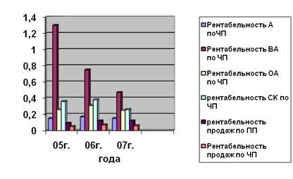 Рисунок 15. Динамика изменения показателей оборачиваемости. Как показывают данные таблицы 7 и рисунков 13,14 и 15 выросли средний срок оборота всех активов (в 2005 году он составлял 120 дней, в 2006- 150 дней, в 2007- 155 дней), средний срок оборота оборотных активов (2005 год 73 дня, 2006- 77 дней, 2007- 105 дней), средний срок оборота денежных средств (2005год- 44 дня, 2006- 53 и 2007- 74 дня), средний срок оборота дебиторской задолженности (в 2005 год он составлял 21 день, в 2006- 27 дней, в 2007- 55 дней), уменьшились средний срок оборота запасов (по сравнению с 2005 годом на 5 дней) и средний срок кредиторской задолженности (на 10 дней). Операционный и финансовый циклы увеличились (на 29 и 35 дней соответственно), что говорит о спаде деловой активности. Увеличение оборота дебиторской задолженности и денежных средств указывает на затруднение расчетов с дебиторами, а увеличение оборота активов на их неэффективное использование. Таким образом деньги вложенные в активы, превращаются в реальные деньги очень медленно, что отрицательно влияет на финансовое положение предприятия. ОАО «НКМК» следует пересмотреть подходы к использованию своих активов и усилить работу с дебиторами организации. 2.9 Анализ показателей рентабельности Рентабельностьпредставляет собой доходность (прибыльность) производственно-торгового процесса. Ее величина измеряется уровнем рентабельности. Если предприятие получает прибыль, оно считается рентабельным. Показатели рентабельности, применяемые в экономических расчетах, характеризуют относительную прибыльность. Прибыль – это денежное выражение основной части денежных накоплений, создаваемых предприятиями любой формы собственности. Как экономическая категория, она характеризует финансовый результат предпринимательской деятельности и является показателем, который наиболее полно отражает эффективность производства, объем и качество производственной продукции, состояние производительности труда, уровень себестоимости [8,c.415] Показатели рентабельности характеризуют эффективность работы предприятия в целом, доходность различных направлений деятельности (производственной, предпринимательской, инвестиционной), окупаемость затрат и т.д. Они более полно, чем прибыль характеризуют окончательные результаты хозяйствования, потому что их величина показывает соотношение эффекта с наличными или использованными ресурсами. Их применяют для оценки деятельности предприятия и как инструмент инвестиционной политики и ценообразования. Анализ показателей рентабельности ОАО «НКМК» представлены в таблице 8 и на рисунке 16. Таблица 8