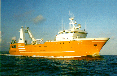 Рис.2 Траулер с кормовым тралением. Разноглубинное траление рыбыРазноглубинное траление рыбы производится с целью вылова больших косяков морской рыбы и других морепродуктов, обитающих на разных уровнях морской среды между океаническим дном и водной поверхностью. В нём принимает участие тот же тип судов, что и при постановке донных тралов на рыбу, но в данном случае эти суда обычно оборудуют ещё и большими сетными тумбами для замётывания в воду ещё больших сетей. Для того, чтобы регулировать глубину подводного траления морской рыбы, поверх перлиня закрепляются специальные грузила и поплавки, а сам невод оборудуется специальными сетевыми распорками. Ловля рыбы с помощью кошелькового невода (обкидные неводы) Сейнеры, оборудованные кошельковыми неводами, выходят на промысел в море с целью вылова таких косяковых пород рыбы, как сельдь, мойва и макрель. Уловы могут быть очень большими, поэтому большое значение имеет высокая грузоподъемность судна. К верхней части рыболовной сети крепятся поплавки, а к нижней - грузила. Поскольку от судна требуется закинуть сеть таким образом, чтобы в центре обкидного невода оказался сразу весь косяк морской рыбы, необходима также хорошая маневренность судна и, особенно, его способность совершать различные повороты и развороты. Существует два типа сейнеров, оборудованных для кошелькового лова морской рыбы. Один из них получил название американского, а другой североевропейского (нордического) сейнера. На обоих типах сейнеров используются силовые установки с гидравлической системой привода. На судах американского типа капитанский мостик и кубрик для членов судовой команды расположены в носовом отсеке, а силовой блок портального крана с грузовой стрелой смонтированы сзади навесной палубы в кормовом отсеке корабля. Сейнеры нордического типа первоначально напоминали суда, оборудованные для бокового траления рыбы. У них навесная палуба, рулевая рубка и кубрик для судовой команды расположены в кормовом отсеке корабля. Блок силового питания обычно располагается по правому борту от рулевой рубки [8,11]. Транспортер с гидравлическим приводом перемещает рыболовные снасти от блока питания к сетному бункеру в кормовом отсеке. После того, как невод накрывает косяк рыбы сверху, сетевой куль стягивается снизу кошельковой лебёдкой, на которую наматывается нижний трос. На следующем этапе начинается перекачка рыбы из кошелькового невода в трюм через сепаратор, разделяющий рыбу и воду. У заново спроектированных и построенных сейнеров нордического типа теперь, как правило, те же габариты, что и у больших траулеров с кормовым тралением. Двойная подвесная палуба пересекает судно от носового до кормового отсека, а сетный бункер располагается на корме. Расположение силового блока питания по-прежнему такое же, как и на первоначальной модели судов этого типа.
