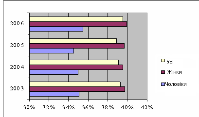 Рисунок 2.5. Динаміка середньої величини загубленого життя загиблого в ДТП в % від очікуваної тривалості життя Більш низькі показники загублених років життя для загиблих у ДТП чоловіків пояснюється їх низькою середньою тривалістю життя в порівнянні з жінками. З точки зору інтересів економіки країни важливим показником є тривалість працездатного періоду життя людини. Дуже тривожним фактом є те, що найбільше число загиблих у ДТП доводиться на активні вікові групи людей від 19 до 60 років. Так, більше 75% гинуть у працездатному віці . Спостерігається стійка тенденція до збільшення частки загиблих у ДТП у працездатному віці як для чоловіків, так і для жінок (Рисунок 2.6.). Аналогічні тенденції характерні й для поранених у результаті ДТП, хоча частка поранених працездатного віку трохи нижче ніж для загиблих, особливо в жінок. У результаті загибелі людини в ДТП, країна губить до 50% його працездатного життя. Для чоловіків у середньому ця величина становить 21 рік, або 51% працездатного віку. Жінки, що гинуть у ДТП, не доживають до кінця працездатного віку в середньому 16,5 років. Проведені недавно соціологічні обстеження показали, що в Україні жінки в середньому перестають працювати у віці 67-69 років. З урахуванням цих даних кожна загибла в ДТП жінка могла б ще працювати в середньому 25,5 років [46].