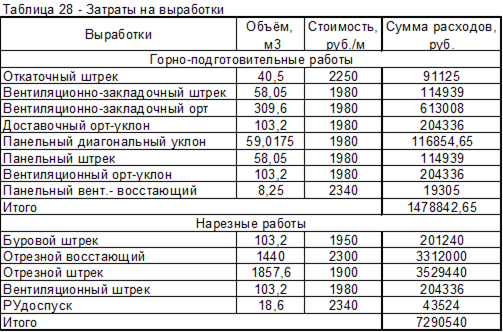 4.3 Источники потерь и разубоживанияК источникам потерь в данных условиях отработки можно отнести потери: камерная система: · потери неотбитой руды на боковом контакте; · потери на крайних камерах; · потери руды в виде рудной корки на стенках закладочного массива, при проходке первой камеры таких потерь не будет; · при проходке смежной камеры потери возникнут со стороны первой камеры; · потери в виде рудной мелочи и по почве камеры; · потери отбитой руды на плинтусах. Так же есть потери в местах геологических нарушений, связанные с оставлением предохранительных целиков. Эти потери являются наиболее крупными. Разубоживание в основном представлено закладочным материалом, отбиваемым с отработкой соседней камеры, а так же породами, прихватываемыми в почве и кровле рудного тела и в местах с невыдержанной мощности: · разубоживание закладкой при проходке сопряжений; · разубоживание руды на боковом контакте; · разубоживание в крайних камерах; · разубоживание на стенках закладочного массива; · разубоживание породой при проходке торцов; · разубоживание закладкой за счет выполаживания слоя; · разубоживание закладкой (мелочью) по почве. слоевая система: · потери неотбитой руды на боковом контакте; · потери на крайних лентах; · потери руды в виде рудной корки на стенках закладочного массива, при проходке первой ленты таких потерь не будет; · потери в виде рудной мелочи и по почве ленты; · потери отбитой руды на плинтусах. Так же есть потери в местах геологических нарушений, связанные с оставлением предохранительных целиков. Эти потери являются наиболее крупными.Разубоживание в основном представлено закладочным материалом, отбиваемым с отработкой соседней ленты, а так же породами, прихватываемыми в почве и кровле рудного тела и в местах с невыдержанной мощности: · разубоживание закладкой при проходке сопряжений; · разубоживание руды на боковом контакте; · разубоживание в крайних лентах; · разубоживание на стенках закладочного массива; · разубоживание породой при проходке торцов; · разубоживание закладкой за счет выполаживания слоя; · разубоживание закладкой (мелочью) по почве. 4.4 Расчет основных технико-экономических показателей систем разработкиСравнение выбранных систем отработки будет произведено постатейно, рассчитана участковая себестоимость одной тонны добытой руды. Окончательный вывод о целесообразности применения той или иной системы разработки будет сделан на основе чистой прибыли, получаемой с одной тонны погашенных балансовых запасов. Основные технико-экономические показатели для сплошной слоевой системы разработки с комбинированным порядком выемки слоев: