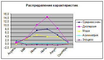 Рисунок 3. Станция Чулпаново: Как видно по графику (рис.4) максимумы среднего значения Ḡ=8,0 и дисперсии Ϭ2=14,5 отмечается в июле, мода принимает максимальное значение в июне М=5. Минимум характеристик наблюдается в апреле (Ḡ=0,5 Ϭ2=0,8 Ϭ=0,9) и сентябре (Ḡ=1,0 Ϭ2=1,1 Ϭ=1,1). В распределении асимметрии и эксцесса нет каких либо скачков. Максимум наблюдается в апреле А=1,7 Е=1,6, затем идет небольшое понижение и далее характеристики описываются малыми значениями и практически не изменяются до сентября.