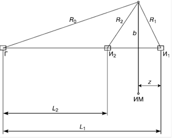 Рис. 3.2. Схема положения кольца. Здесь L1 и L2 – расстояния от имитирующих катушек И1 и И2 до генераторной катушки Г, b – радиус кольца, z – расстояние от плоскости кольца до измерительной катушки И1, ток в генераторной катушке изменяется по закону J = J 0 ∙ eiωt . Рабочая частота зонда ƒ = ω /2 π . Комплексное сопротивление цепи кольца на рабочей частоте R + iX . Активное сопротивление R складывается из потерь в высокоомном проводе и в конденсаторе, включённом в разрыв цепи. Реактивное сопротивление X = 1/ ωC – ωL . В этом случае ЭДС, наводимая в j -ой измерительной катушке, равна: