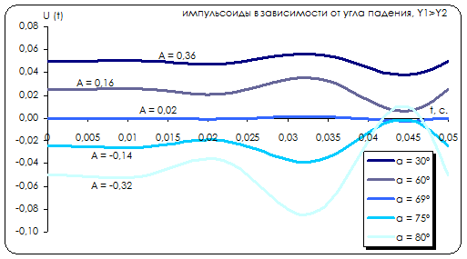 Анализируя полученные графики, видим, что по мере увеличения различий физических свойств между средами критический угол α0 уменьшается. Покажем изменение амплитуды отражённого сигнала, в зависимости от спектрального коэффициента отражения для Среды 2. В качестве исходного сигнала возьмём импульс Берлаге, вычисляемого по формуле