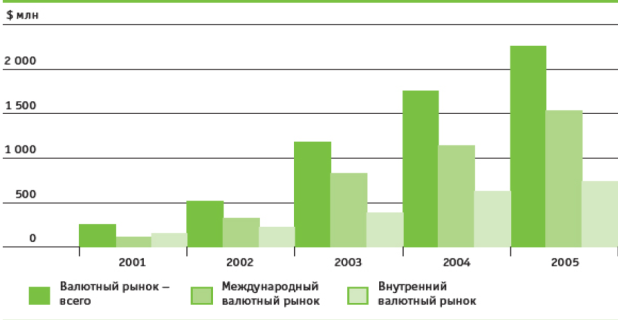 2.3 Анализ операций ОАО «Альфабанк» на международном и внутреннем валютном рынке Альфа-Банк сохраняет позиции одного из ведущих операторов на внутреннем валютном рынке. В 2005 году общий оборот по сделкам рубль/доллар США составил 150 миллиардов долларов США, то есть около 68% общего оборота внутреннего валютного рынка. В 2005 году Банк стал одним из лидеров форвардного рынка рубль/доллар США. Предлагаемые Банком операции "форвард" позволяют клиентам хеджировать валютные риски, что особенно актуально из-за стремления ЦБ РФ перейти от жесткого регулирования курса рубль/доллар США к свободному курсообразованию и полной конвертируемости рубля. За 2005 год в 1,3 раза выросли объемы форвардных операций. Банк стал участником срочного рынка ММВБ. Объем форвардных сделок и сделок "своп", заключенных в 2005 году, превысил 1,4 миллиарда долларов США. Банк активно развивает операции "своп", что позволяет выйти на более высокий уровень управления ликвидностью и снизить себестоимость фондирования. В 2005 году более чем в 2 раза вырос объем взаимных кредитных линий с другими банками, в первую очередь за счет увеличения лимитов иностранными банками и их дочерними структурами.