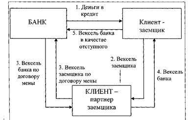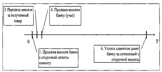 Рис. 7. Операция выдачи опосредованного кредита Литературный источник[6, с.14] Вексель, попав к поставщику товара, немедленно меняется на деньги в банке, его выпустившем (учет векселя) (действия 4, 5 на рис. 7). Суть этой операции более наглядно видна на ее временной диаграмме (рис. 8).