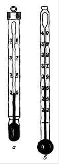 Рис. 3. Кататермометры: а — цилиндрический; б— шаровой. Скорость движения воздуха от 0,5 до 10 м/с измеряют крыльчатым анемометром (рис.2, а), а от 1 до 20 м/с - чашечным (рис.2, б). Устройство и принцип их работы во многом сходны между собой. Посаженное на ось легкое колесо с лопастями (у крыльчатого анемометра) или чашечками соединено системой зубчатых колес с механизмом вращения стрелок. Центральная стрелка основного циферблата показывает единицы и десятки оборотов колеса, а стрелки малых дополнительных циферблатов - сотни и тысячи. С помощью расположенного сбоку рычага (арретира) можно разъединить ось и механизм вращения стрелок или соединить их. Перед проведением измерений записывают показания циферблатов и устанавливают прибор в место контроля так, чтобы ось вращения крыльчатого анемометра была параллельна направлению движения воздуха, а чашечного анемометра - перпендикулярна. После набора оборотов крыльчатки с помощью арретира одновременно включают регистрирующий механизм и секундомер. Через 1...2 мин регистрирующий механизм выключают и снова снимают с него показания. Разделив разность конечного и начального показаний счетчика на время экспозиции, выраженное в секундах, находят число делений, которые прошла стрелка прибора за единицу времени. Затем по тарировочному графику, прилагаемому к каждому анемометру, определяют скорость движения воздуха в метрах в секунду. Скорость движения воздуха менее 1 м/с измеряют кататермометром (рис.3), который представляет собой спиртовой термометр с большим шаровым или цилиндрическим резервуаром и капилляром, расширяющимся в верхней части. Принцип действия кататермометра основан на зависимости скорости охлаждения спирта в резервуаре от скорости омывания его воздухом. Перед измерением кататермометр опускают в теплую (60...70 °С) воду и держат в ней до заполнения спиртом половины верхнего резервуара. Обтерев кататермометр, подвешивают его в зоне контроля скорости движения воздуха и, следя за снижением спиртового столбика, с помощью секундомера регистрируют время уменьшения температуры от 38 до 35 °С. Затем находят отношение охлаждающей способности воздуха Н к разности температур Q кататермометра (36,5 °С) и воздуха в помещении в момент измерения. Охлаждающую способность воздуха, мкал/ (с∙см2 ), определяют по формуле H = F/ T, где F - фактор прибора, представляющий собой потери теплоты в милликалориях с 1 см2 поверхности кататермометра за время его охлаждения от 38 до 35 °С (значение F указано на обратной стороне прибора); Т - время, в течение которого столбик спирта опустится с 38 до 35 °С, с. Зная значение H/ Q, по справочным данным находят скорость движения воздуха. Порядок обеспечения рабочих и служащих спецодеждой и средствами защитыРаботодатель обязан (ст.221, 212 ТК) приобретать за счет организации и по установленным нормам бесплатно выдавать работникам, занятым на работах с вредными или опасными условиями труда, в особых температурных условиях и на работах с загрязнением сертифицированные средства индивидуальной защиты, а также смывающие и обезвреживающие средства. Он обязан также за свой счет обеспечить хранение (в специальных гардеробных), стирку, сушку, дезинфекцию, дегазацию, дезактивацию и ремонт выданных по нормам СИЗ. Работник обязан (ст.214 ТК) использовать выданные ему СИЗ и правильно приме