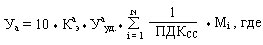 10-коэффициент, учитывающий аварийный характер выброса; Ка э - коэффициент, учитывающий экономическую значимость иэкологическое состояние атмосферного воздуха региона, где случилась авария или пожар; Уа уд - удельный экономический ущерб от загрязнения атмосферного воздуха с учётомкоэффициента индексации цен (руб./усл. т); ПДКСС - предельно-допустимая концентрация среднесуточная для воздуха (мг/м ); Мi - масса i-го загрязнителя попавшего в окружающую среду (т). УNO а = 10*2*280,5*1/50*400 = 4488000 руб. УСО а = 10*2*280,5*1/30*200=3740000 руб. Усажа а = 10*2*280,5*1/5*300 = 33660000 руб. Уа = УNO а +УСО a +Уcaжa a = 11594000 руб. Экономический ущерб от загрязнения водных объектов определяем по формуле: