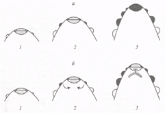 Рис. 3. Схематическое изображение начальных этапов развития генеративной меристемы мутанта сеп (а) и растений львиного зева дикого типа (б). 1 - момент закладки цветковых меристем; 2 и 3 - апекс генеративной меристемы через 2 и 6 дней с момента закладки цветковых меристем. Цветковые меристемы показаны черным цветом, вегетативные - белым, апикальные меристемы - точками. Прицветники не показаны. В мутанте cen ген FLO после некоторой задержки активируется в апикальной меристеме. В растениях дикого типа экспрессия FLO индуцирует экспрессию CEN. В субапикальной зоне (сигнал от FLO показан стрелками, зона экспрессии GEN заштрихована). Активация CEN ингибирует экспрессию FLO в апикальной меристеме. Вывод Гены, о которых говорилось выше, необходимы для успешного перехода к цветению. Можно выделить две группы таких генов: гены, влияющие на время индукции цветения, и гены идентичности цветковых меристем. |