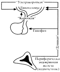 Рис 2. Уровни функционирования обратной связи. Под “длинной” цепью обратной связи подразумевается взаимодействие периферической эндокринной железы с гипофизарными и гипоталамическими центрами (не исключено, что и с супрагипоталамическими и другими областями ЦНС) посредством влияния на указанные центры изменяющейся концентрации гормонов в циркулирующей крови. Под “короткой” цепью обратной связи понимают такое взаимодействие, когда повышение гипофизарного тропного гормона (например, АКТГ) модулирует и модифицирует секрецию и высвобождение гипофизотропного гормона (в данном случае кортиколиберина). “Ультракороткая” цепь обратной связи – вид взаимодействия в пределах гипоталамуса, когда высвобождение одного гипофизотропного гормона влияет на процессы секреции и высвобождения другого гипофизотропного гормона. Этот вид обратной связи имеет место в любой эндокринной железе. Так, высвобождение окситоцина или вазопрессина через аксоны этих нейронов и посредством межклеточных взаимодействий (от клетки к клетке) модифицирует активность нейронов, продуцирующих эти гормоны. Другой пример, высвобождение пролактина и его диффузия в межваскулярные пространства приводит к влиянию на соседние лактотрофы с последующим угнетением секреции пролактина. “Длинная” и “короткая” цепи обратной связи функционируют как системы “закрытого” типа, т.е. являются саморегулирующими системами. Однако они отвечают на внутренние и внешние сигналы, изменяя на короткое время принцип саморегуляции (например, при стрессе и др.). Наряду с этим на указанные системы влияют механизмы, поддерживающие биологический циркадный ритм, связанный со сменой дня и ночи. Циркадный ритм представляет собой компонент системы, регулирующий гомеостаз организма и позволяющий адаптироваться к изменяющимся условиям внешней среды. Информация о ритме день-ночь передается в ЦНС с сетчатки глаза на супрахиазматические ядра, которые вместе с эпифизом образуют центральный циркадный механизм – ”биологические часы”. Помимо механизма день-ночь, в деятельности этих “часов” принимают участие другие регуляторы (изменение температуры тела, состояние отдыха, сна и др.). 5. Гормональная регуляция углеводного, липидного, белкового и водно- солевого обмена Основные энергетические ресурсы живого организма — углеводы и жиры обладают высоким запасом потенциальной энергии, легко извлекаемой из них в клетках с помощью ферментных катаболических превращений. Энергия, высвобождаемая в процессе биологического окисления продуктов углеводного и жирового обменов, а также гликолиза, превращается в значительной степени в химическую энергию фосфатных связей синтезируемого АТФ. Аккумулированная же в АТФ химическая энергия макроэргических связей, в свою очередь, расходуется на разного вида клеточную работу — создание и поддержание электрохимических градиентов, сокращение мышц, секреторные и некоторые транспортные процессы, биосинтез белка, жирных кислот и т.д. Помимо «топливной» функции углеводы и жиры наряду с белками выполняют роль важных поставщиков строительных, пластических материалов, входящих в основные структуры клетки, — нуклеиновых кислот, простых белков, гликопротеинов, ряда липидов и т.д. Синтезируемая благодаря распаду углеводов и жиров АТФ не только 