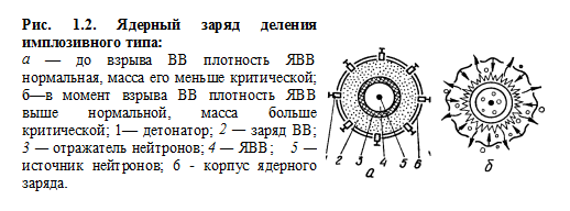 Для соединения двух кусков заряда можно использовать выстрел одной части заряда в другую его часть, закрепленную в противоположном конце прочного металлического цилиндра, напоминающего орудийный ствол. Реакция деления инициируется от специального источника нейтронов. Такие заряды называют зарядами "пушечного" типа. Второй способ предполагает сильное обжатие подкритической массы ядерного вещества, что повышает плотность вещества заряда и переводит систему в надкритическое состояние, так как критическая масса обратно пропорциональна квадрату плотности вещества.