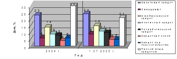 Рисунок 2.1 – Динамика структуры кредитов, обращаемых на кредитном рынке России Спрос на кредитном рынке России определяют, прежде всего, следующие факторы: 1.Срок, условия возврата и стоимость предлагаемых кредитов; 2. Гарантии участников кредитного рынка, защищенность их интересов; 3. Динамика спроса и предложения на кредитном рынке; 4. Денежно – кредитная политика государства; 5. Виды обеспеченности возврата кредитов; 6. Инфляция; 7. Деловая репутация участников рынка кредитов; 8.Социальные факторы: уровень доходов населения, уровень безработицы и т.д. Кредитный рынок России можно дифференцировать на четыре основных сегмента: · Денежный рынок – совокупность краткосрочных кредитных операций, обслуживающих движение оборотных средств; · Рынок капиталов – совокупность средне- и долгосрочных кредитных операций, обслуживающих движение основных средств в экономике страны; · Фондовый рынок – совокупность кредитных операций, обслуживающих рынок ценных бумаг; · Ипотечный рынок - совокупность кредитных операций, обслуживающих рынок недвижимости. Каждый из сегментов кредитного рынка имеет свои специфические особенности в части функционирования и развития, что на практике привело к созданию различных кредитных учреждений, специализированных финансовых институтов (инвестиционных, ипотечных и т.д.): Формирование рыночных отношений в России сопровождается изменением статуса большинства участников кредитного рынка, расширяя их круг и вовлекая новые структуры. Исходя из этого, участниками рынка кредитов в России могут выступать: - предприятия, находящиеся в частной, государственной, муниципальной собственности и собственности общественных организаций (акционерные общества, товарищества, производственные объединения и т.д.); - коммерческие банки; - государство в лице Центрального банка; - органы государственной власти различного уровня; - население как кредитор. Сформировавшийся кредитный рынок в России отвечает основным международным стандартам. Он имеет правовую основу, защищающую интересы участников рынка, регулируется государством (о чем будет рассмотрено в следующих пунктах данной курсовой работы). Кредитный рынок развивается по следующим основным принципам: - дифференцированность кредитования; - обеспеченность и платность предлагаемых и предоставляемых кредитов; - государственная поддержка развития кредитного рынка; - соблюдение всех правовых норм, закрепляющих права и обязанности участников рынка и т.д. Знание и соблюдение основных принципов функционирования кредитного рынка сформирует достаточно прочную основу для долговременного и успешного его развития в будущем. Денежный рынок обусловлен наличным и безналичным обращением. По действующему законодательству в России два вида денежных знаков: банкноты (банковские билеты) и монеты. Банкноты и монеты являются безусловными обязательствами Банка России и обеспечиваются всеми его активами. Официальной денежной единицей на отечественном денежном рынке является рубль, официальный курс которого устанавливается Центральным Банком РФ. Наличный оборот в России составляет более 30 % (Приложение 1). Налично-денежный оборот в Российской Федерации обслуживается банкнотами и металлической монетой. Так, на конец 2005 г. в денежной массе наличные деньги занимали 37 %, средст