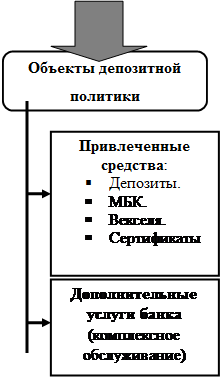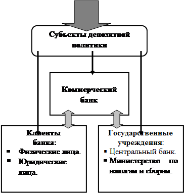 Рисунок 1 – Состав субъектов и объектов депозитной политики коммерческого банка К специфическим принципам депозитной политики относятся принципы обеспечения оптимального уровня издержек банка, безопасности проведения депозитных операций, надежности, поскольку банк, осуществляя аккумуляцию временно свободных денежных средств с целью их последующего размещения, стремится получить доход не любой ценой, а с учетом реалий рынка, на котором он осуществляет свою деятельность. Соблюдение перечисленных принципов позволяет банку сформировать как стратегические, так и тактические направления в организации депозитного процесса, обеспечивая тем самым эффективность и оптимизацию его депозитной политики.